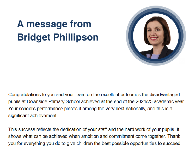 All the staff, governors and families work hard together to ensure that all Downside children are given the opportunity to achieve and reach their potential. We are so proud that this hard work was recognised recently by the Secretary for Education Bridget Phillipson and we look forward to continuing to give the opportuntites to succeed.