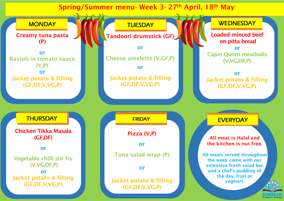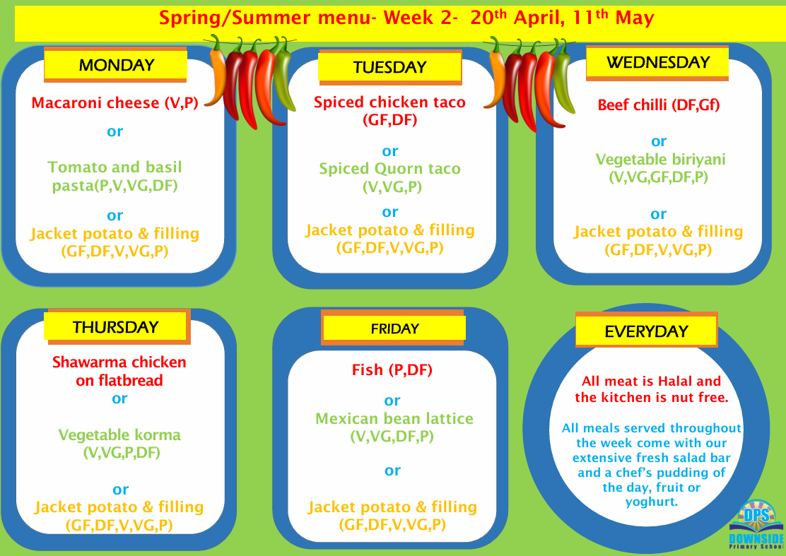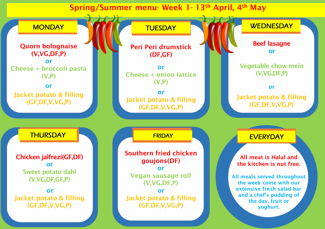 Every morning, children will order their meal using the coloured menu. Children will then be given a coloured sticker and the dinners will be cooked to order. Please discuss the menu with your child, so that making the choice is easy!